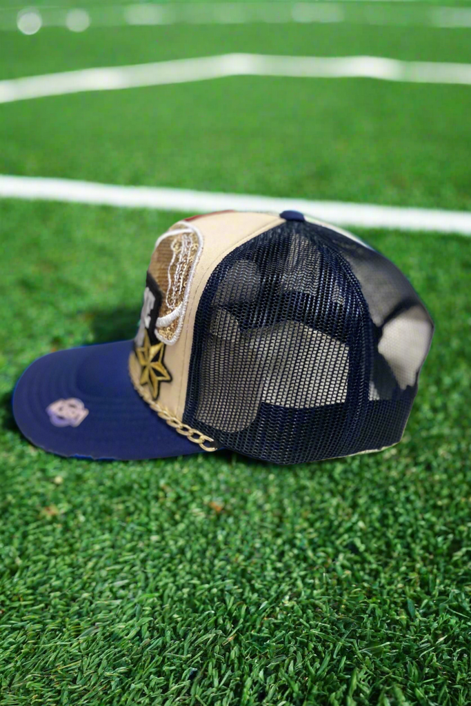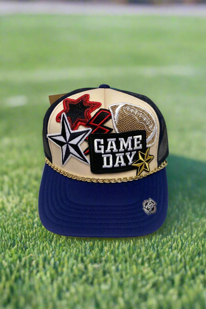 Get ready to cheer in style with our Game Day Glam Patch Trucker Cap! This statement-making hat is designed with bold embroidered and sequin patches, including glitter stars, a sparkling football, and the iconic “GAME DAY” lettering. Finished with a chic gold chain detail across the brim, it’s the perfect mix of sporty and glam.