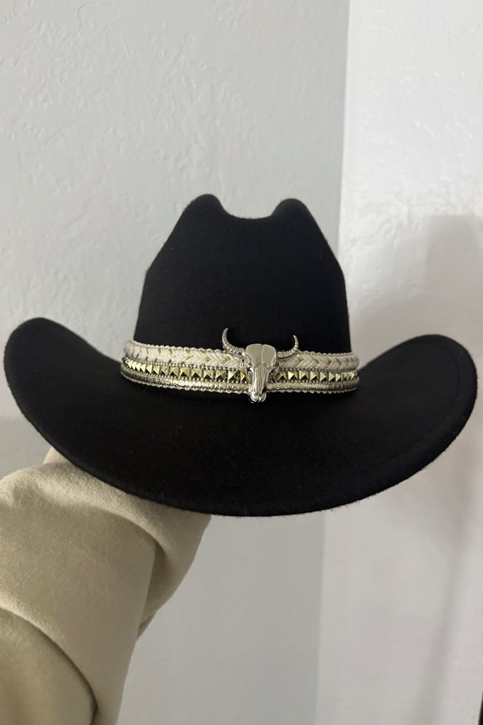 The Silver Spur Rodeo Luxe Hat is a refined take on classic Western style, designed for the modern cowgirl with an eye for detail. Crafted in a structured cowboy silhouette, this elevated felt hat is finished with a layered braided band accented by gold-tone stud detailing and a polished silver steer skull centerpiece.