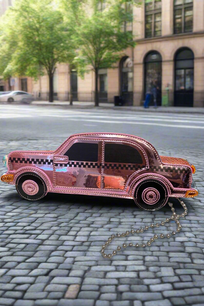 Get ready to turn heads with this ultra-cute The Pink Couture Cab Handbag! Shaped like a vintage taxi cab and decked out in shiny metallic pink with bold black detailing, this quirky accessory is perfect for fashionistas with a playful side. Whether you're heading out for a night on the town or just want to add a little fun to your everyday look, this bag delivers charm with every mile.