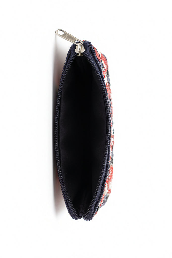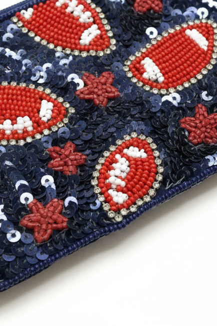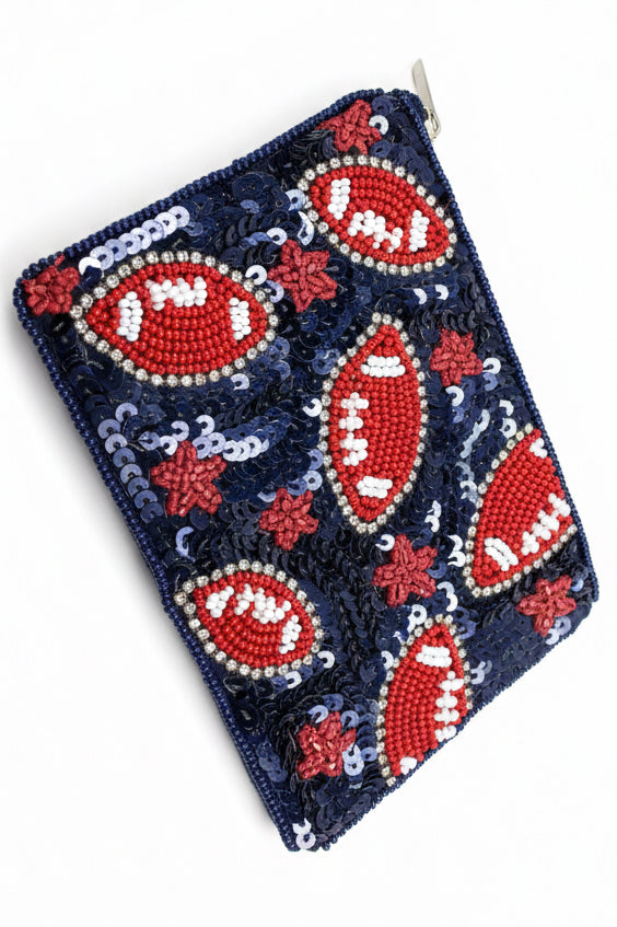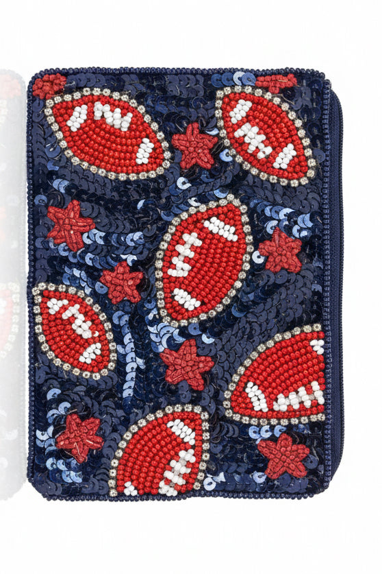 This statement zip pouch features an all-over hand-beaded design with football icons and star accents on a rich navy background, giving it the perfect mix of sporty and glam.
