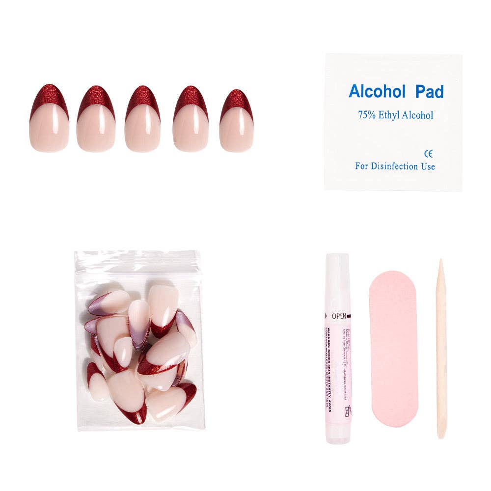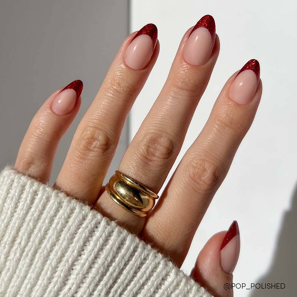 The Red Affair nail set is ready to glam up your holiday season! It's hard not to love the deluxe scarlet-red glitter french tips that adorn a semi-transparent, natural base. Plus, our most popular short almond shape elongates your fingers and gives you a sleek and effortless look you can wear day or night!