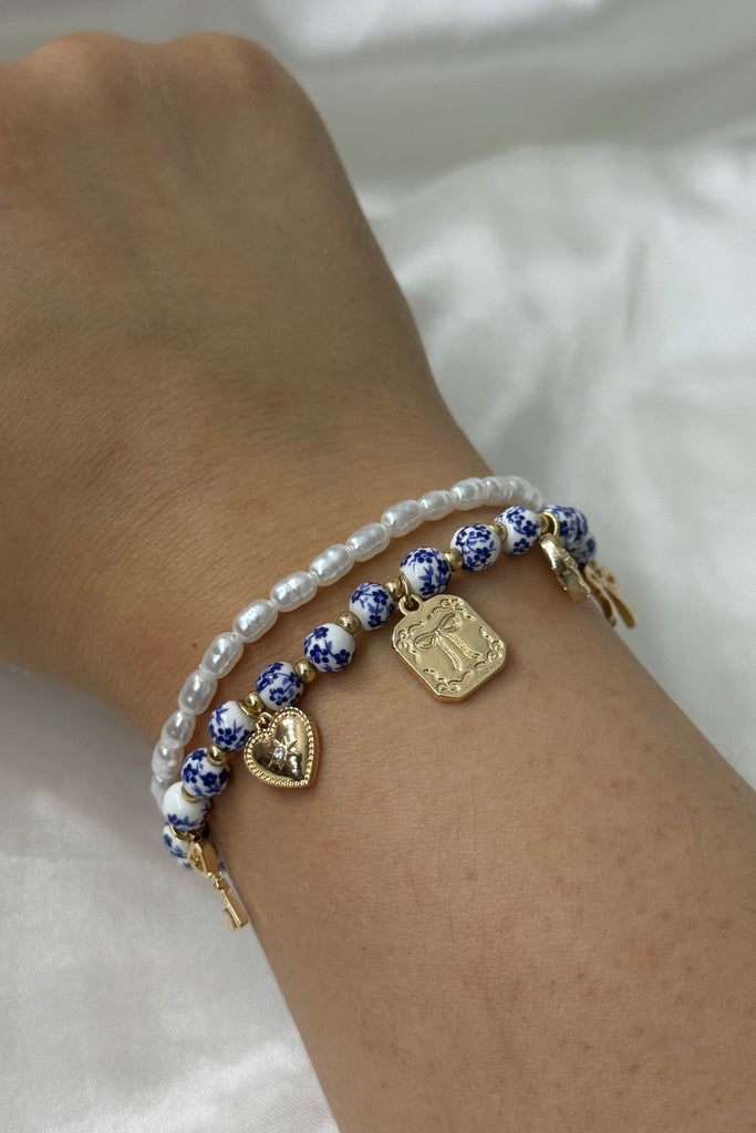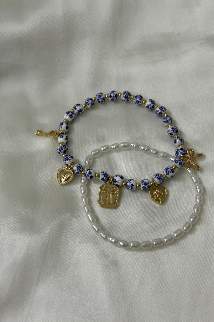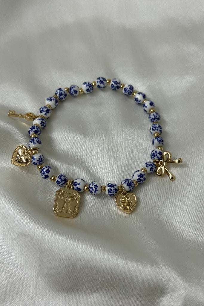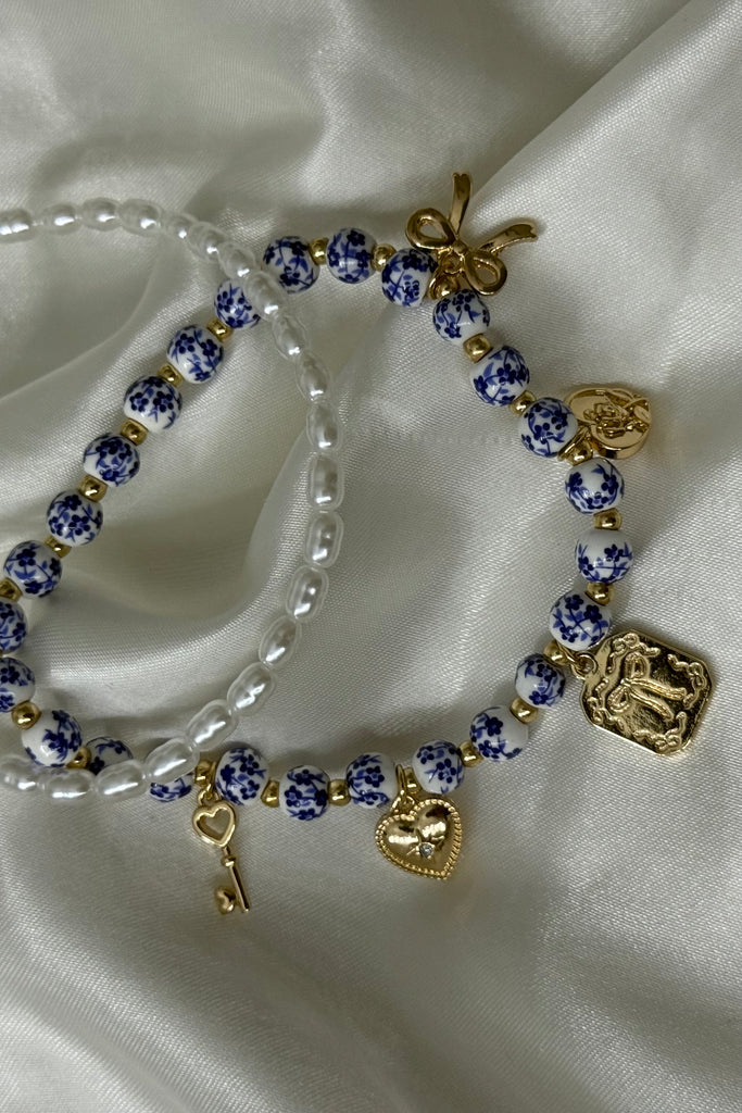 Step into your soft girl era with the Coquette Blue Belle Charm Bracelet Set — a dreamy mix of elegance, vintage charm, and delicate detail. This layered bracelet features blue floral porcelain-inspired beads, soft white pearl accents, and dainty gold-tone charms including hearts, a key, and a vintage-style monogram centerpiece.