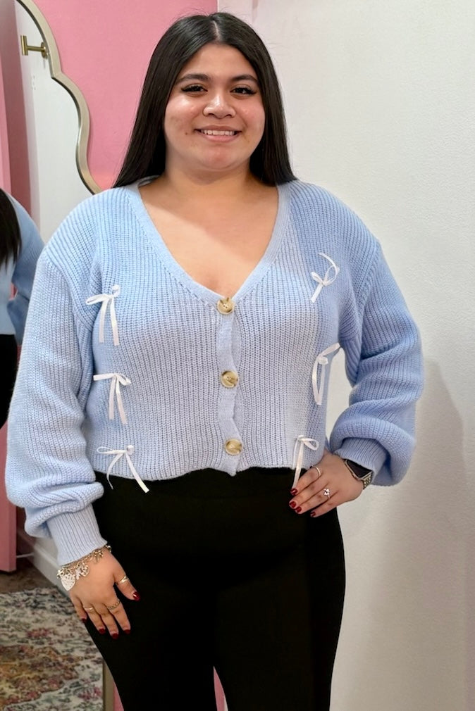 Say hello to your new soft-girl favorite 💕 The Love Letter Blue Ribbon Button-Front Knit Cardigan is the definition of cozy romance. Designed in a dreamy baby-blue knit, this cardigan features a flattering V-neckline, dainty button-front closure, and the sweetest ribbon bow details that feel straight out of a love note.