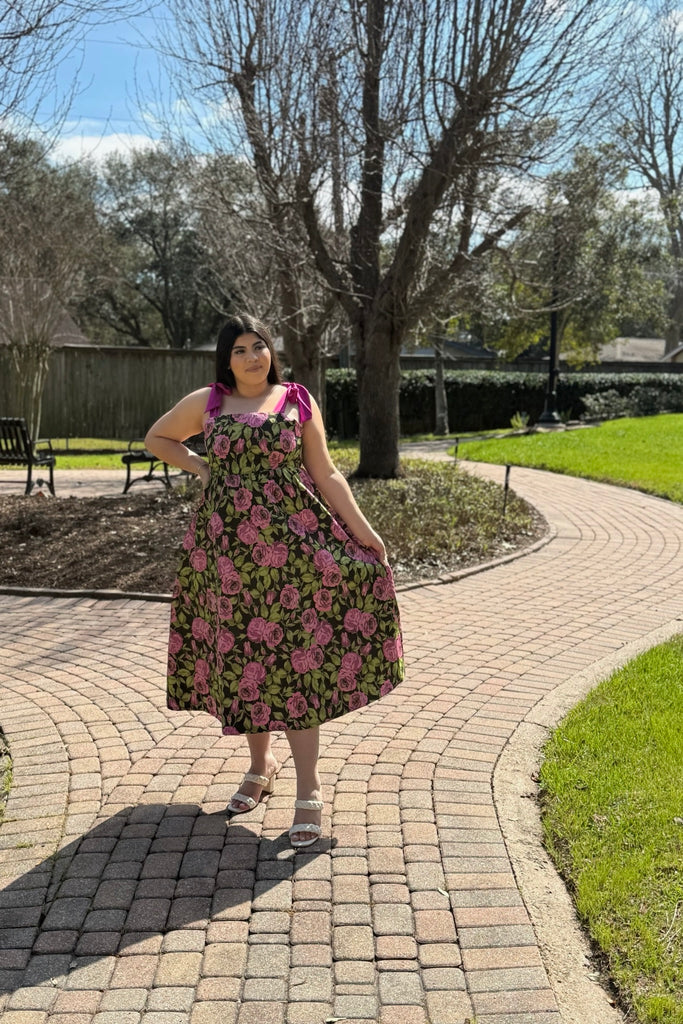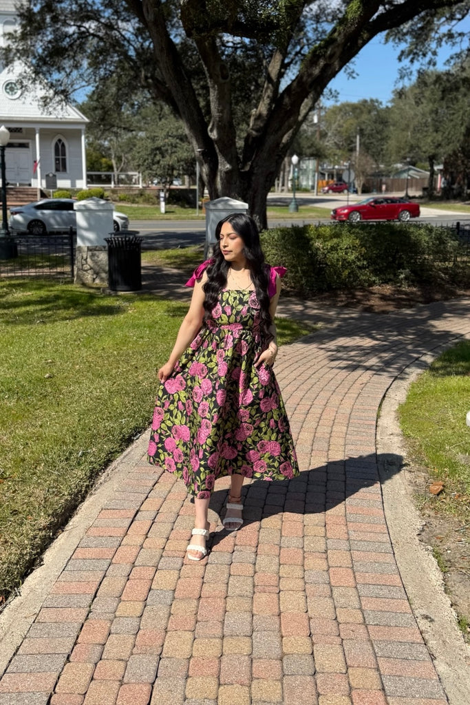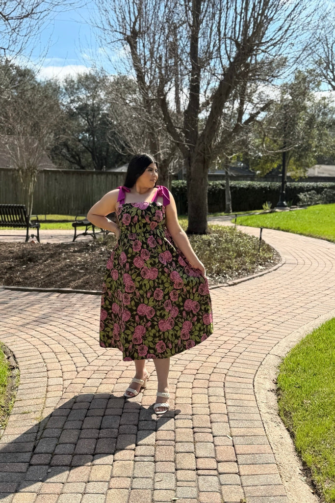 Featuring a vibrant pink rose print against a deep backdrop, this midi dress is designed with a flattering structured bodice and adjustable tie-shoulder straps for the sweetest finishing touch. The flowy skirt creates beautiful movement while keeping the silhouette comfortable and feminine.