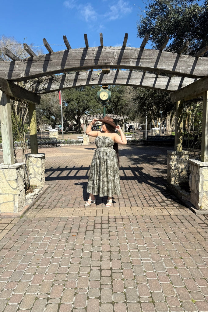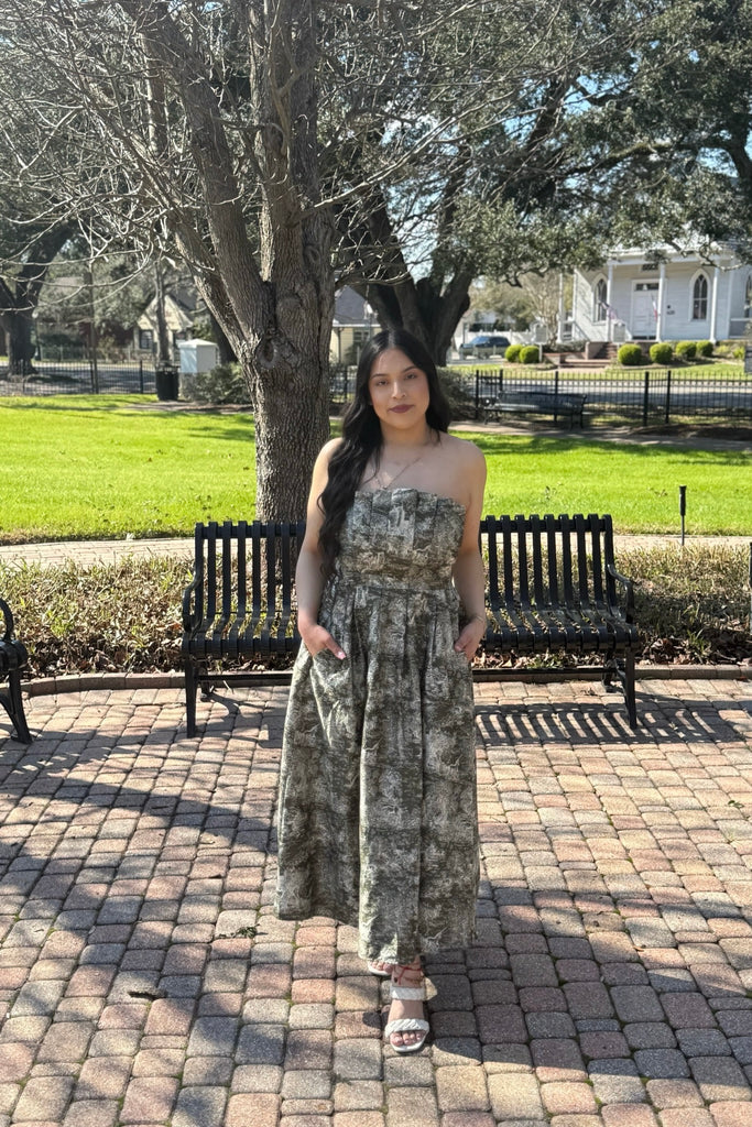 Designed with a structured strapless bodice and a flattering cinched waist, this midi-length silhouette flows beautifully with every step. The muted sage-toned toile-inspired print gives it that romantic, countryside feel — perfect for brunch dates, baby showers, garden parties, or spring events.