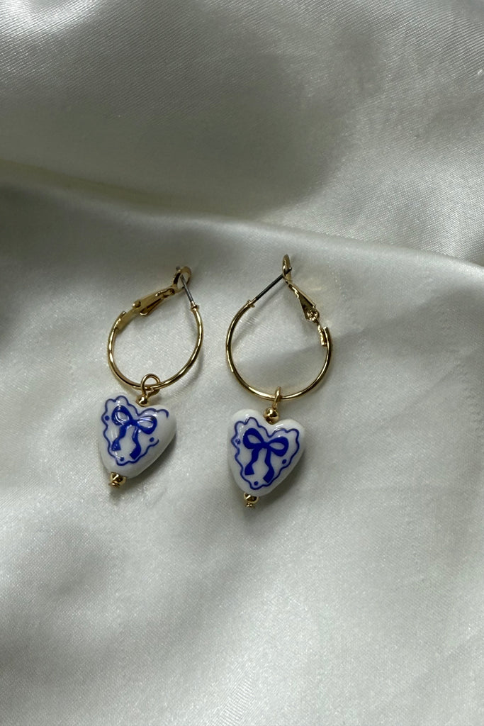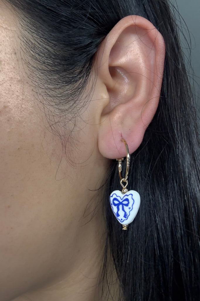 Blue Bow Ceramic Heart Drop Hoop Earrings