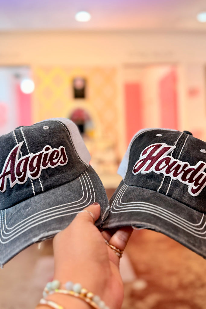 Our Aggies & Howdy Distressed Trucker Hats bring together vintage denim, maroon embroidery, and classic Southern charm. Whether you’re cheering on your team, strolling Main Street, or dressing up your everyday outfits, these hats add the cutest touch to any look.