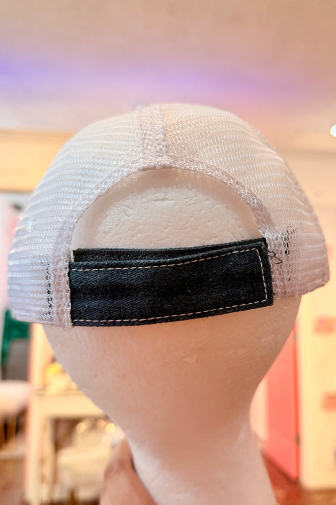 Each hat features raised embroidered lettering, contrast stitching, a breathable white mesh back, and an adjustable snap closure. Distressed edges give that perfectly lived-in finish we love.