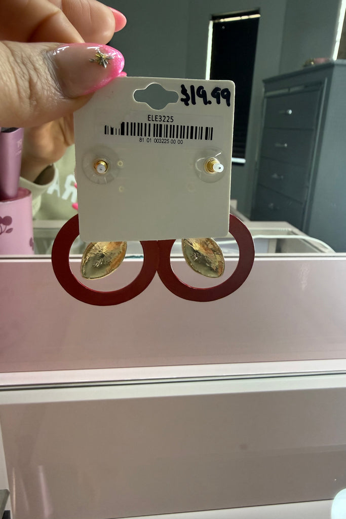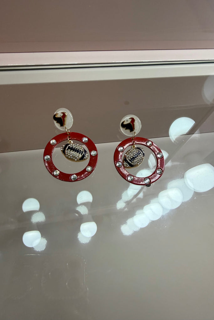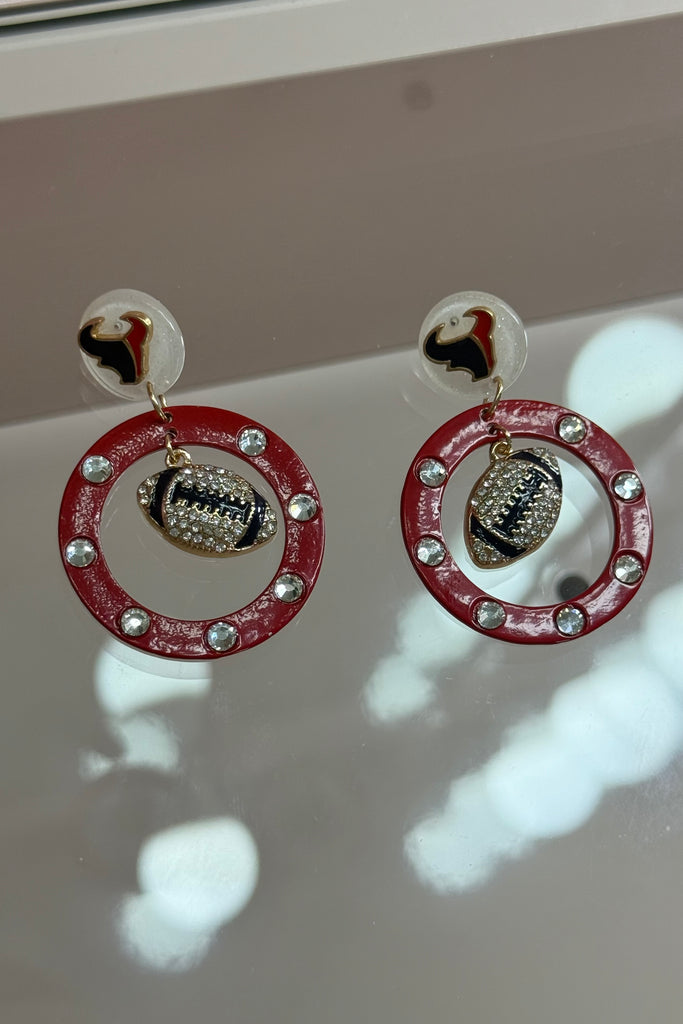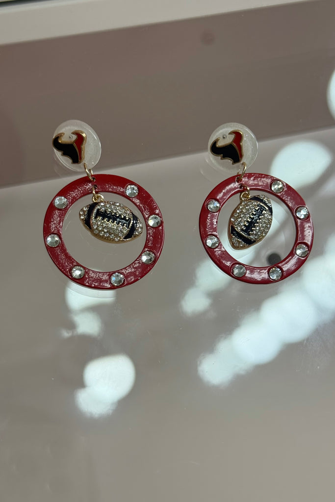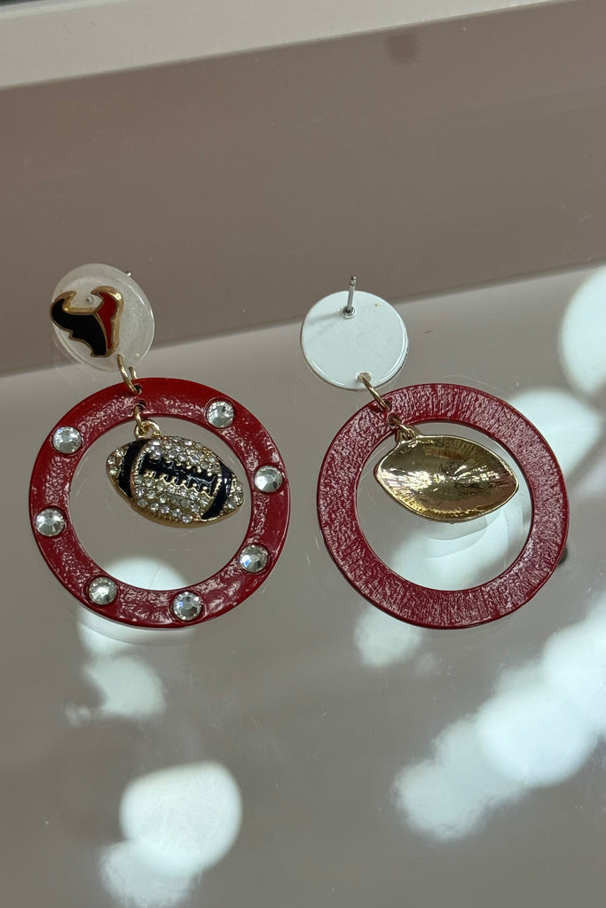 These statement earrings feature a bold red circular drop accented with shimmering crystal details and a dangling crystal football charm at the center. Finished with a Texas-inspired color palette and a sporty-meets-glam design, they’re perfect for football season and beyond.