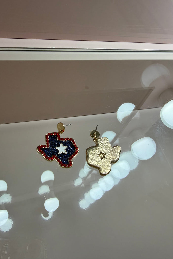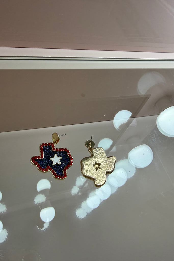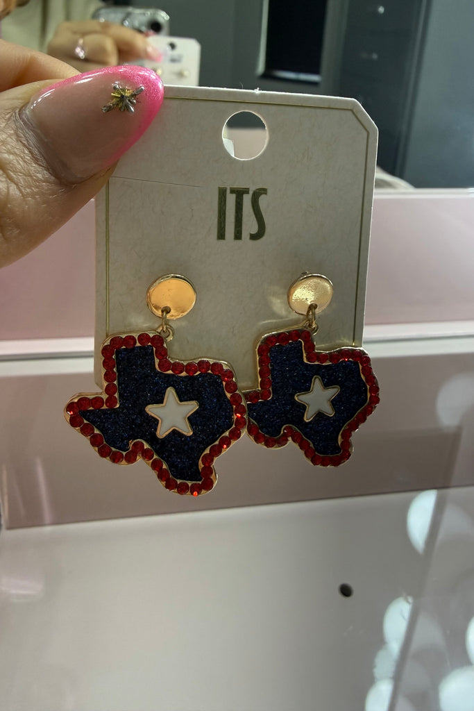 Designed in the iconic Lone Star State shape, these statement earrings feature a rich navy glitter center, a glossy star detail, and a bold red crystal trim for the perfect mix of patriotic and boutique glam.
