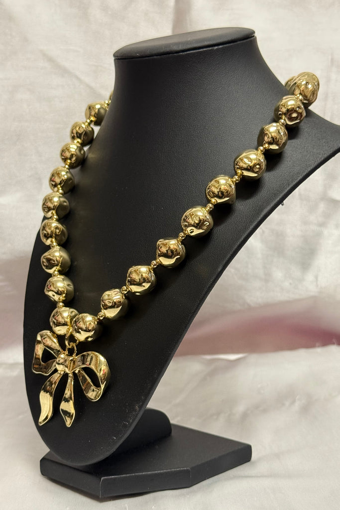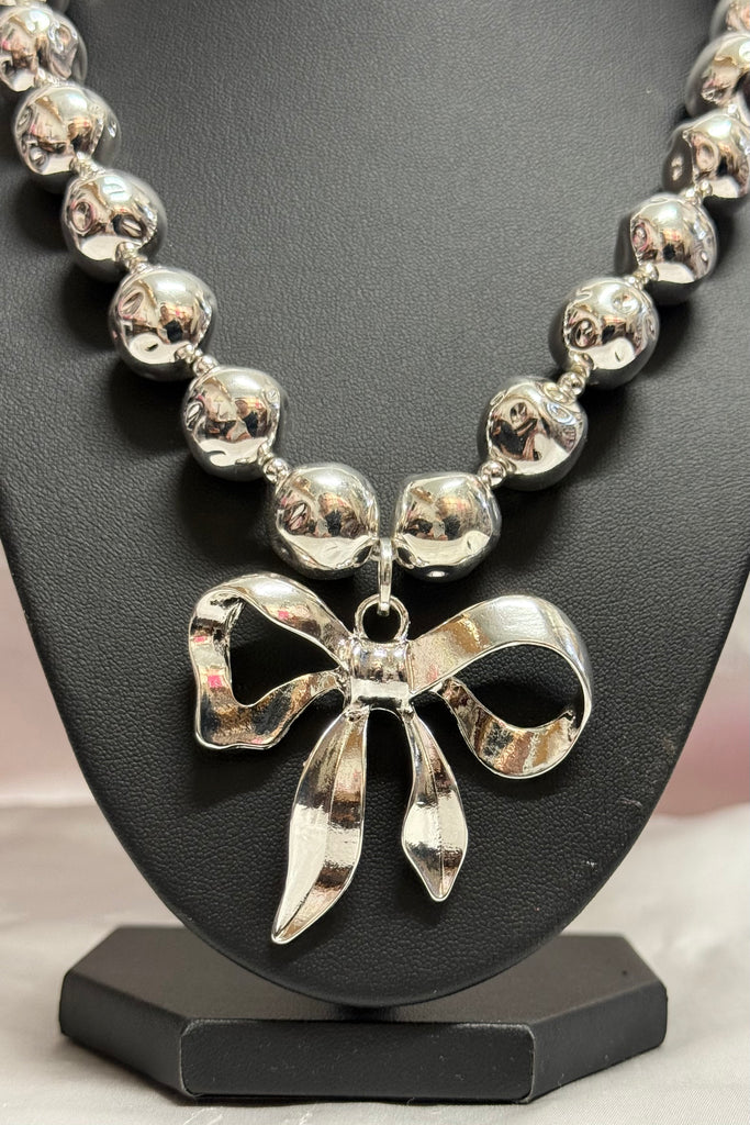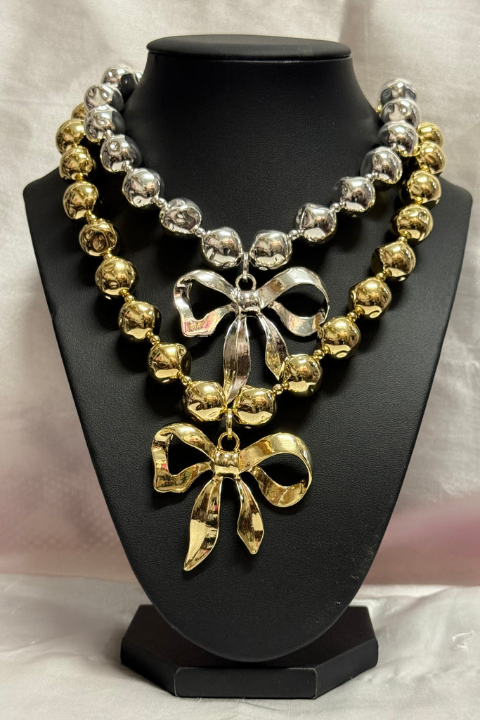 Turn heads and elevate any outfit with our Bold Metallic Bow Statement Necklace. This stunning piece features two luxurious strands of oversized metallic beads—one in brilliant gold and the other in sleek silver—offering the perfect balance of glam and edge.