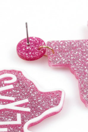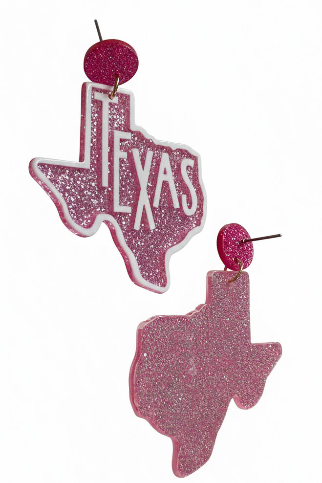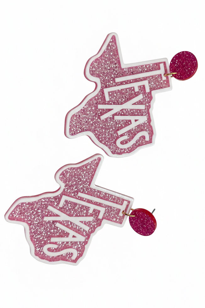 Designed in the iconic Texas shape and finished with shimmering pink glitter and bold “TEXAS” lettering, these earrings are the perfect mix of girly glam and state pride.