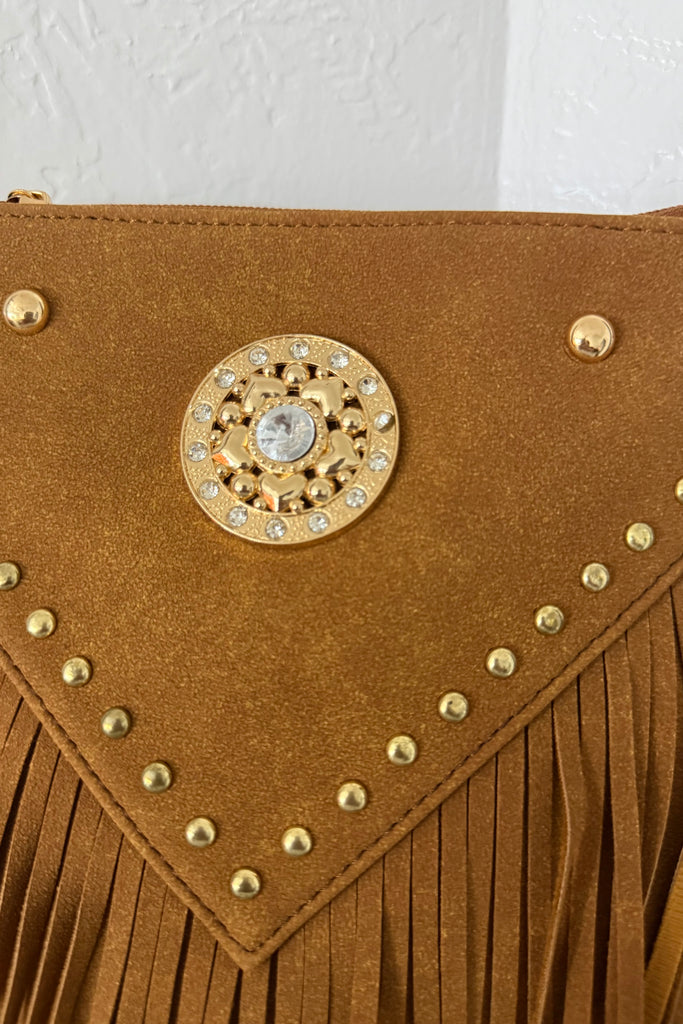 Meet your new western glam obsession ✨🤎 The Golden Hour Cowgirl Fringe Crossbody is serving bold rodeo energy with the prettiest girly boutique twist. Designed in a rich caramel brown tone, this beauty features gold stud detailing, a statement rhinestone concho centerpiece, and dramatic fringe that moves with every step.