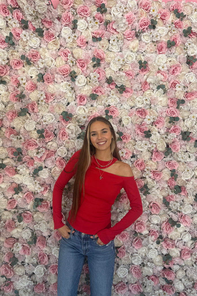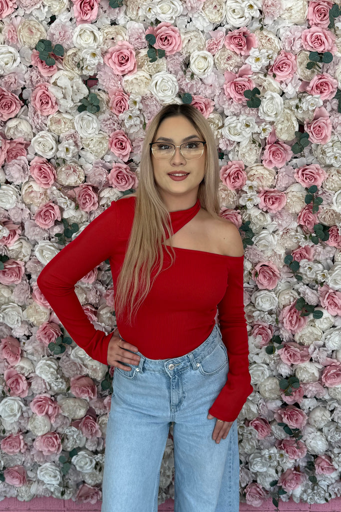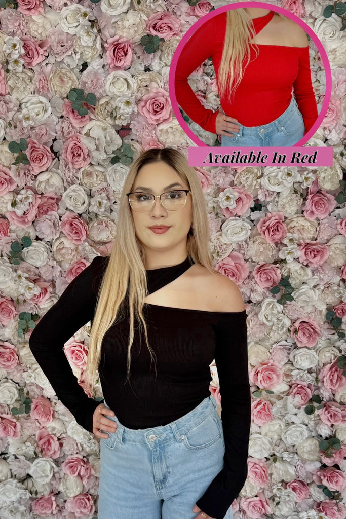 Turn heads with this bold and modern asymmetrical neckline top. Available in striking red or classic black, it’s the perfect mix of edgy and elegant. Made from a soft, stretchy fabric for a flattering fit, this top easily transitions from day to night. Pair it with jeans for a casual statement or a skirt for a night out.