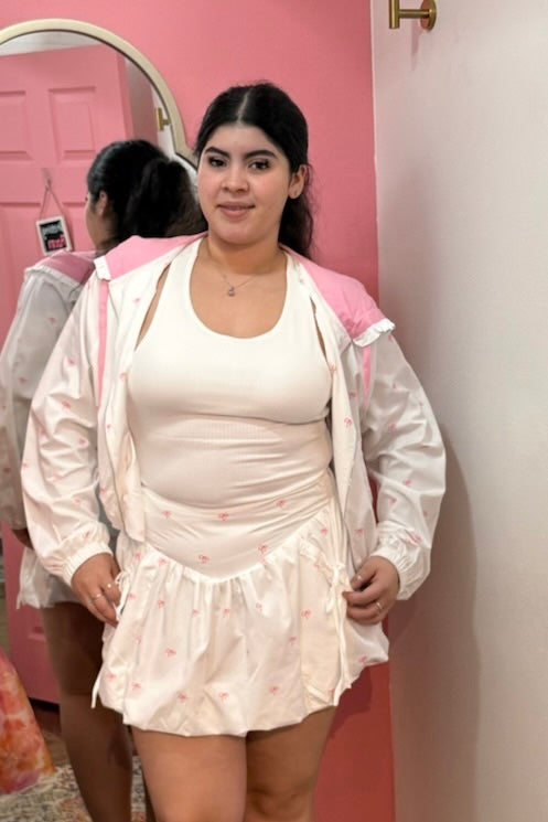 Flirty, sporty, and oh-so-coquette 💕 This two-piece set features a crop windbreaker jacket with a ruffled hoodie and adorable ribbon bow print, paired perfectly with a matching bubble hem mini skort. Lightweight yet full of personality, this set is perfect for brunch dates, shopping days, or any time you want to stand out with sweet-girl confidence.