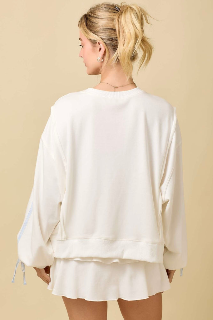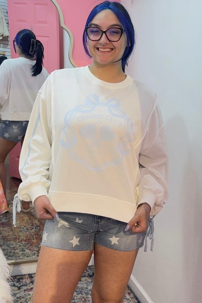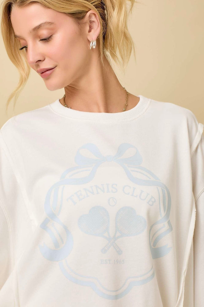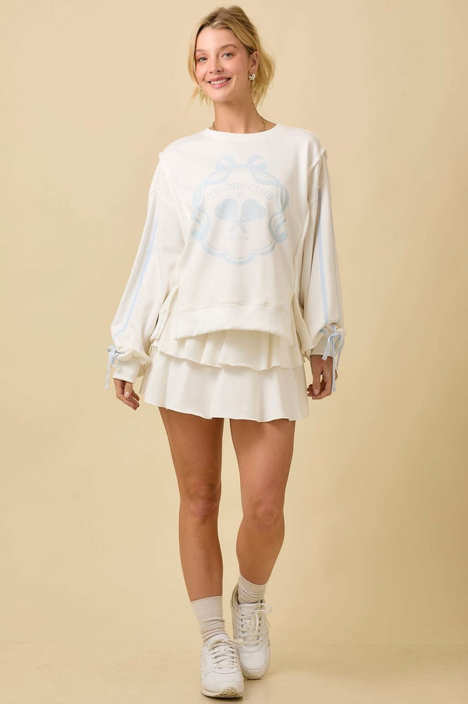 Serve up effortless style with our Tennis Club Graphic Print Oversized Semi-Crop Top. Designed with a relaxed, sporty fit, this top features a bold tennis-inspired graphic and unique sleeve twill tape tie details for an elevated athletic look.