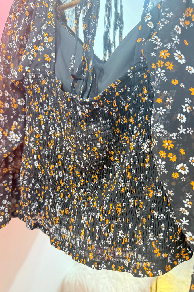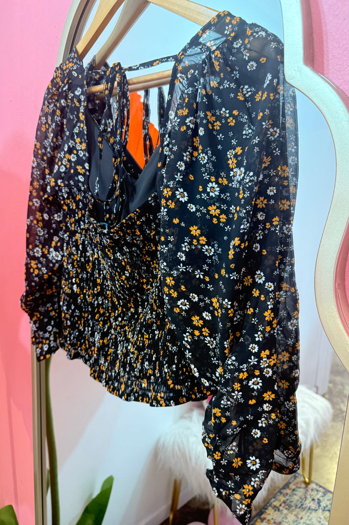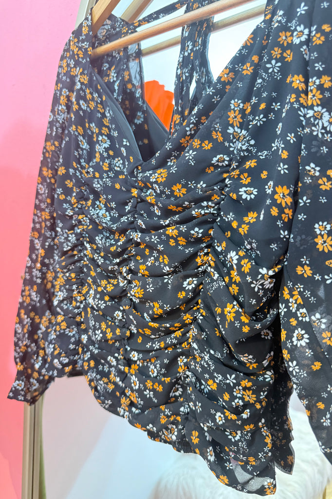 Sweet, flirty, and effortlessly chic — this floral ruched blouse is perfect for dressing up your everyday look. Featuring a flattering ruched front, flowy long sleeves, and a feminine tie-back detail, it’s the kind of top that moves with you from brunch to date night. The black base with dainty orange and white flowers makes it easy to pair with jeans, skirts, or layered under a jacket.