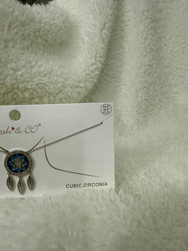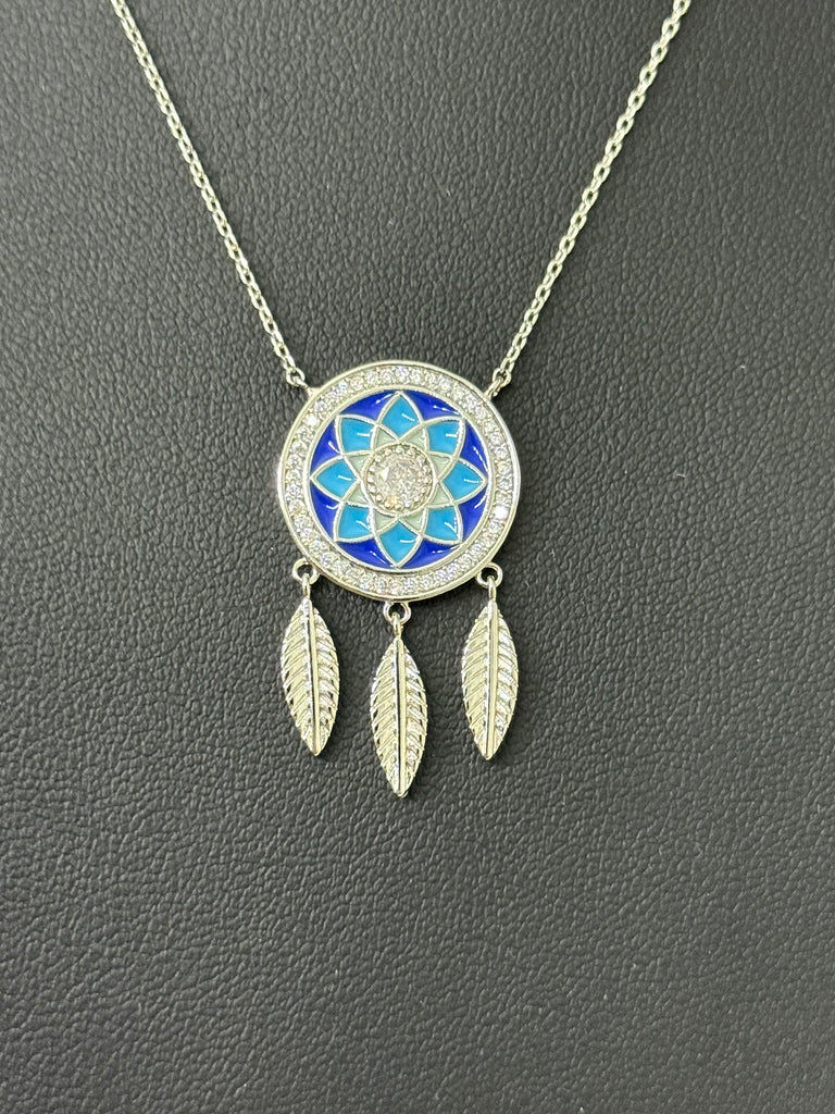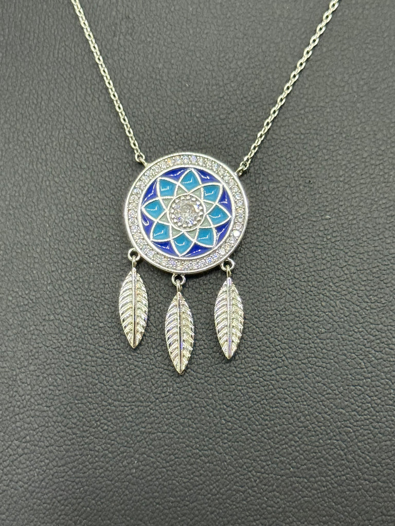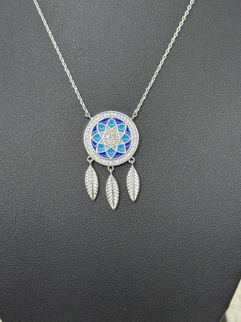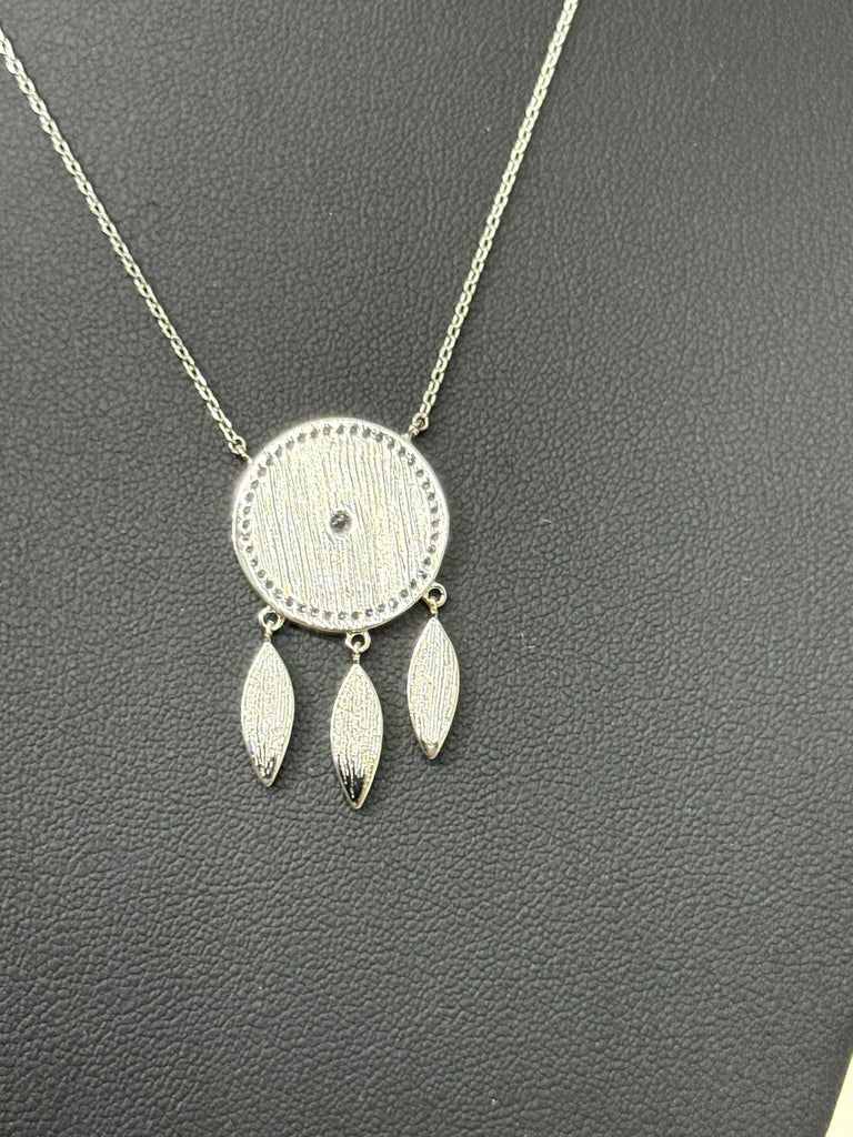 Embrace peaceful vibes and bohemian charm with this beautifully crafted Dreamcatcher Necklace. Featuring an intricately detailed dreamcatcher pendant adorned with cubic zirconia and delicate feather charms, this piece is white gold dipped for a sleek, radiant finish.