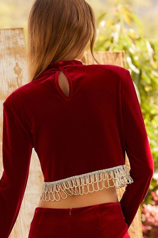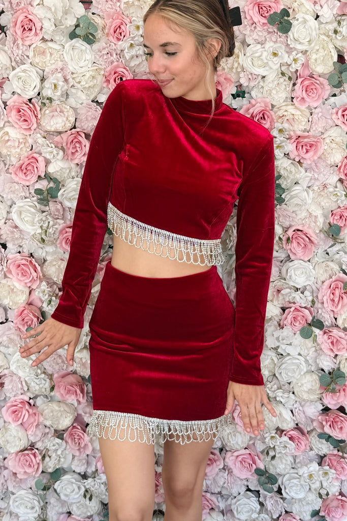 Make an entrance this holiday season in our Rhinestone Velvet Top & Skirt Set — a stunning blend of elegance and glamour. Crafted from soft, stretch velvet that catches the light just right, this set was made for festive nights and unforgettable celebrations.