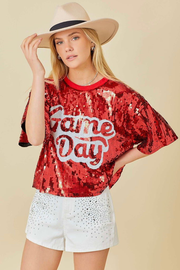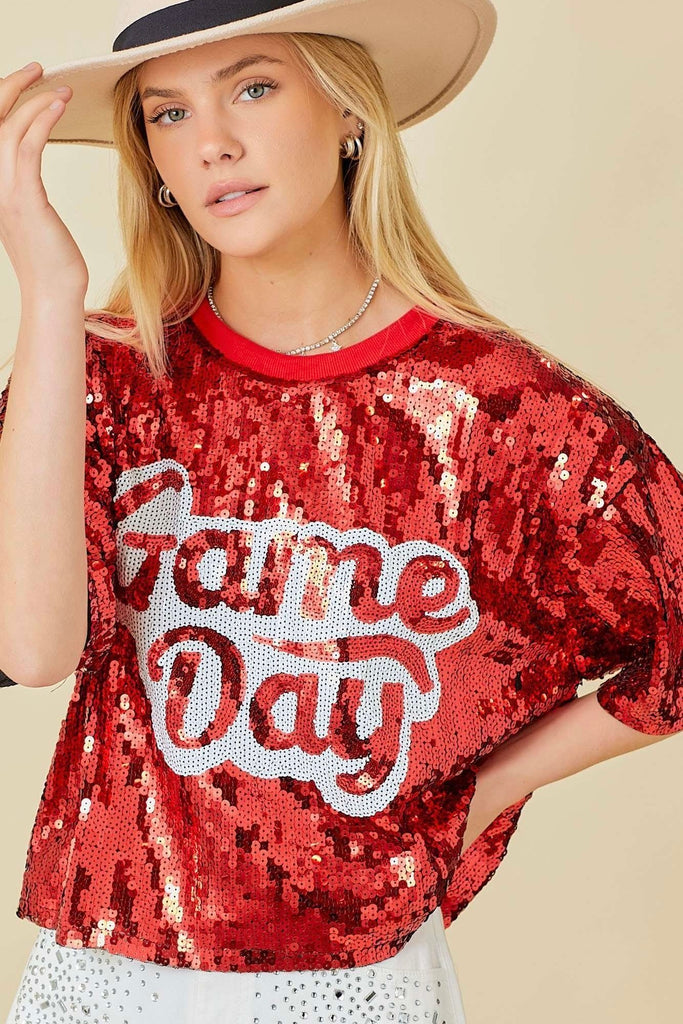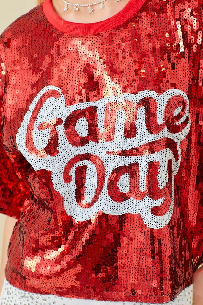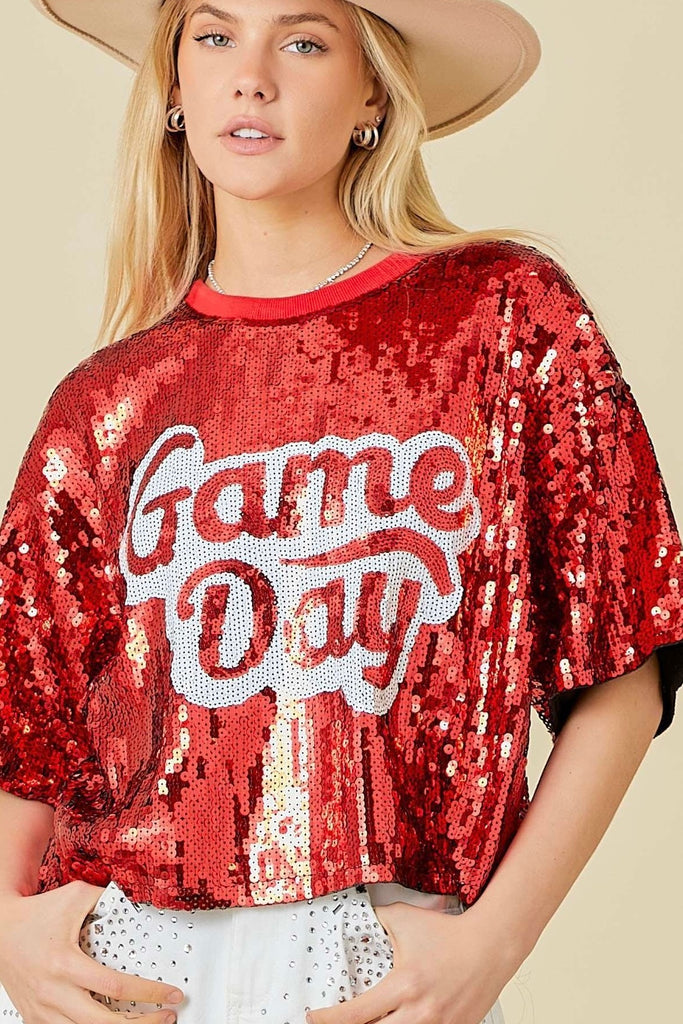Make a statement and shine bright on game day with our Game Day Sequin Short Sleeve Top. Featuring allover red sequins and a bold “Game Day” graphic across the front, this top is designed to turn heads and bring the spirit. The relaxed fit and lightweight feel make it comfortable enough to wear from kickoff to the final whistle.
