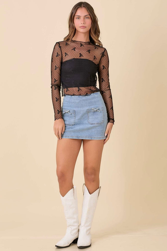 Add a flirty, feminine touch to your look with our Ribbon Bow Mesh Long Sleeve Top. Designed in a sheer black mesh with an allover bow pattern, this top is the perfect blend of playful and chic. Featuring a fitted silhouette and lightweight feel, it layers beautifully over bralettes, camis, or bandeaus. Dress it up with denim and heels or style it casually with a tank and sneakers for an effortlessly stylish vibe.