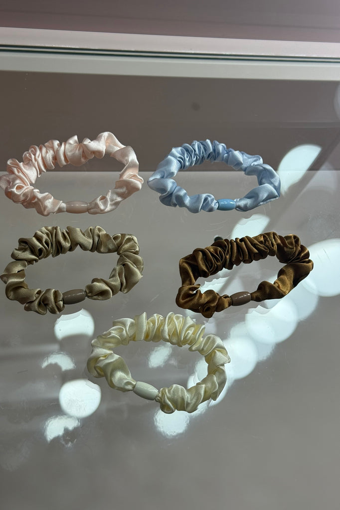 • Five (5) soft scrunchies in neutral and coastal-inspired shades