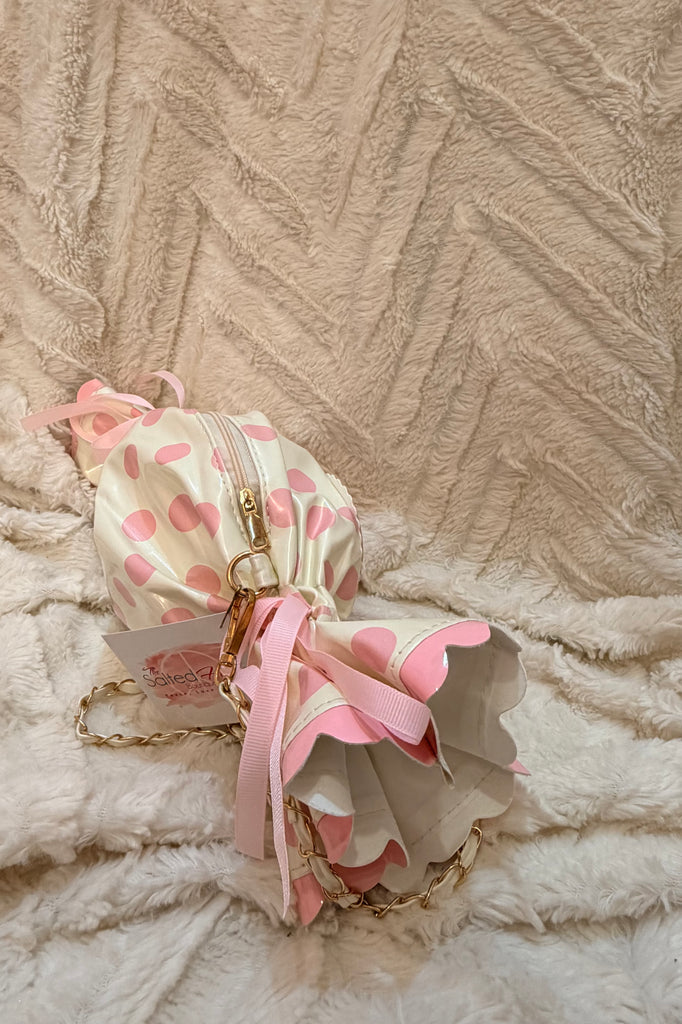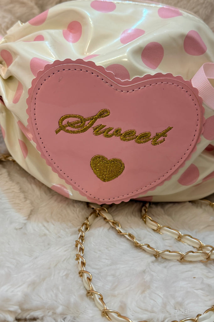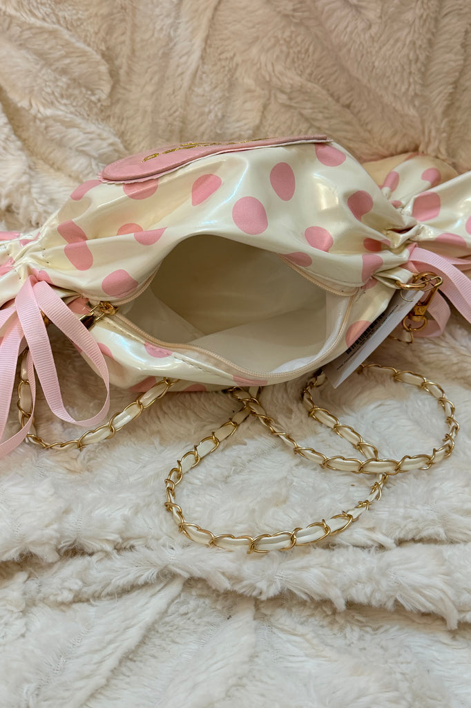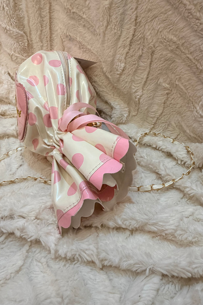 The Sweetheart Candy Crush Crossbody Bag is the ultimate girly statement piece your closet has been craving. Designed in an adorable candy-inspired silhouette with soft pink polka dots, bow-tied ends, and a heart detail that says “Sweet,” this bag is giving full coquette energy.