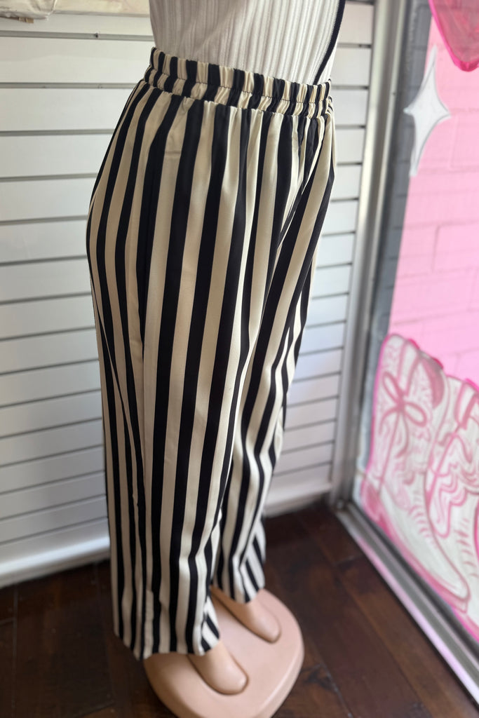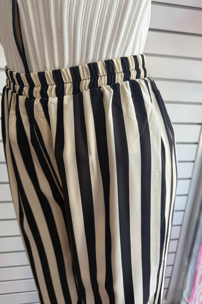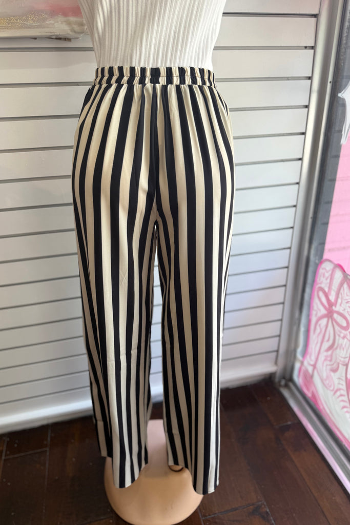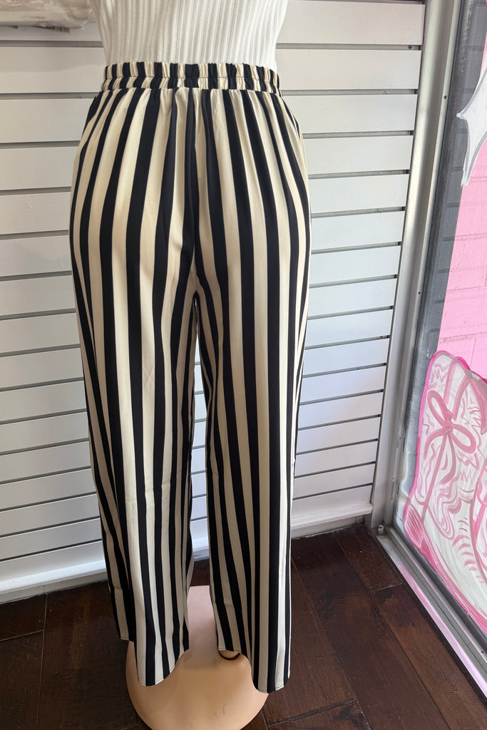 Featuring striking black and cream vertical stripes, these pants are designed to elongate your silhouette while serving effortless confidence. The comfortable elastic waistband makes them easy to wear all day, while the flowy straight-leg fit keeps things chic, elevated, and on-trend.