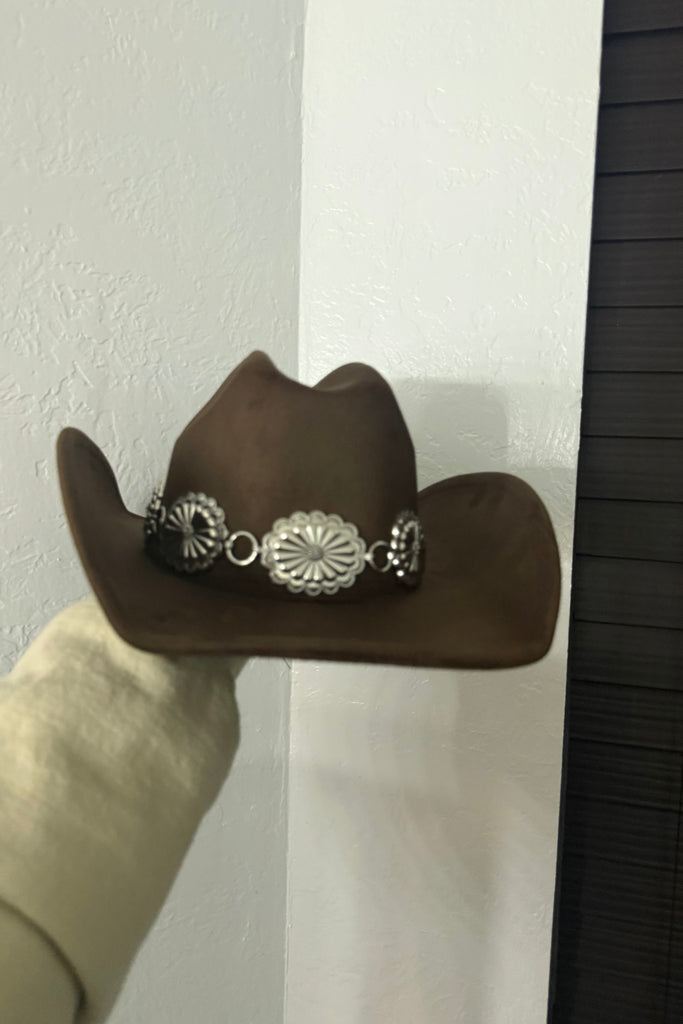 Rooted in classic Western heritage and elevated with refined detail, the High Plains Heirloom Concho Rodeo Hat is a timeless statement piece designed for the modern cowgirl. Crafted in a structured cowboy silhouette, this luxe felt hat is finished with an ornate silver-tone concho band—bringing authentic rodeo character with boutique sophistication.