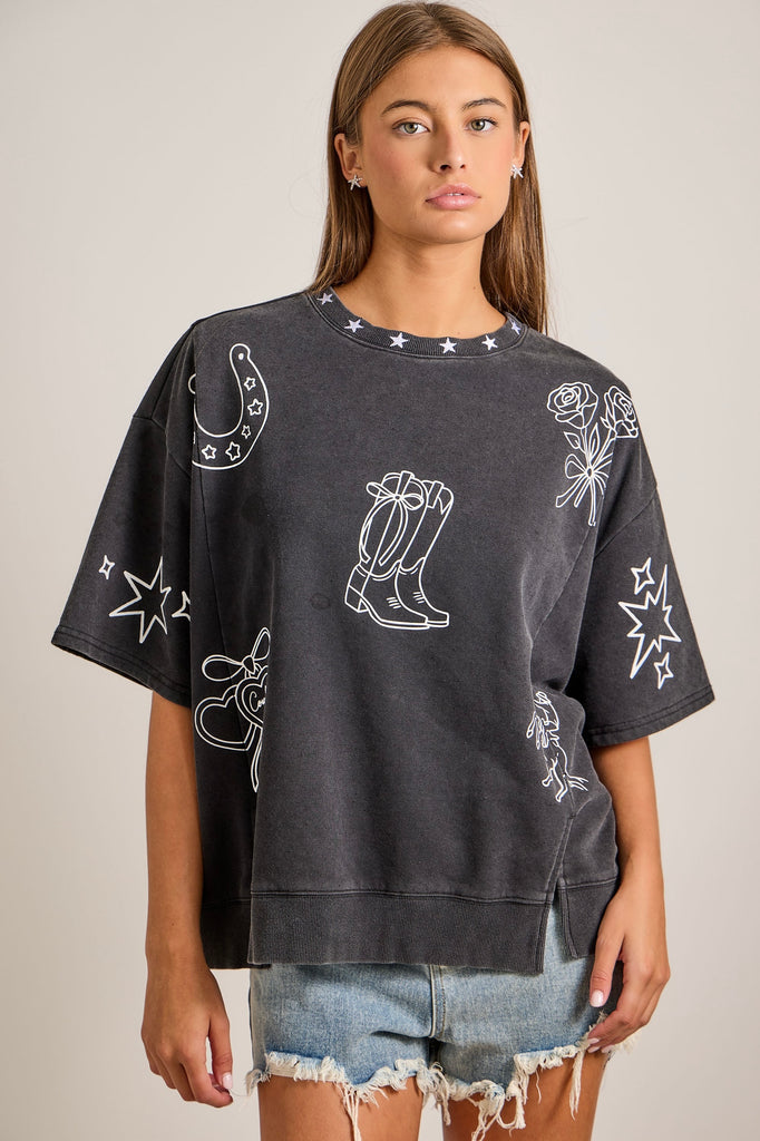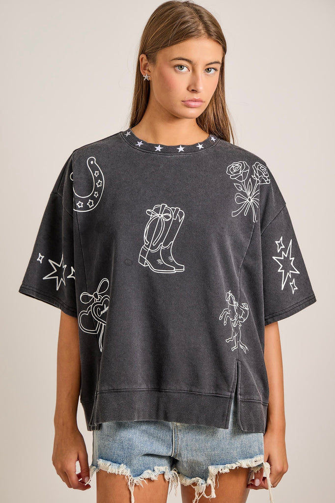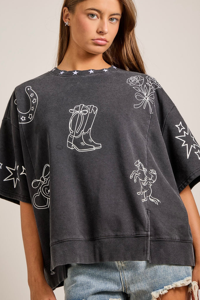 Sweet meets western in the Boots & Bows Rodeo Pullover. Designed for the cowgirl who loves a soft, feminine touch with classic Texas rodeo vibes, this pullover features hand-drawn western sketches—cowboy boots, stars, bows, and rodeo details—bringing playful charm to an everyday favorite.
