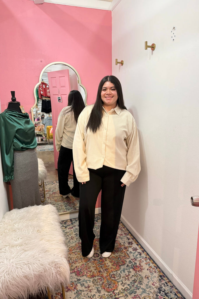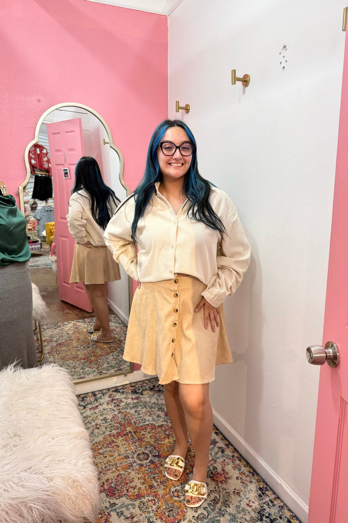Soft, creamy, and effortlessly chic. The Vanilla Corduroy Shirt is a plush button-up with that cozy ribbed texture we love. It’s the perfect layering piece — throw it over a tank, pair it with denim, or style it open with leopard for a fun mix of textures.