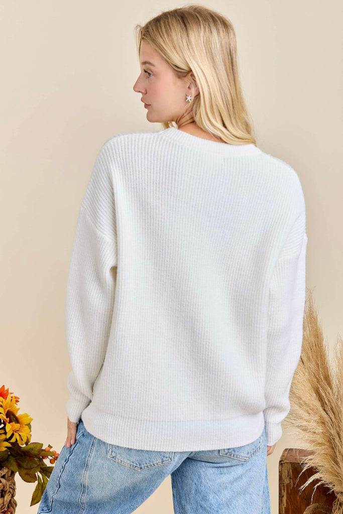 Add a touch of cozy charm to your fall wardrobe with our Hello Pumpkin embroidered knit sweater! Crafted from a soft, lightweight knit, this pullover is perfect for pumpkin patch visits, Thanksgiving gatherings, or just sipping coffee on a crisp fall morning. The playful white embroidery adds a sweet seasonal statement, while the relaxed fit keeps it comfy and effortlessly cute.