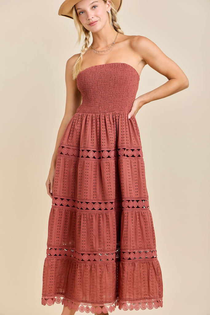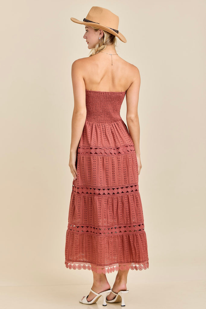 Turn heads with our Smocked Eyelet Maxi Dress, a timeless piece that captures effortless boho charm and breezy elegance. Designed with a strapless smocked bodice that offers a flattering, comfortable fit, and a tiered skirt adorned with intricate eyelet lace panels, this dress moves beautifully with every step.