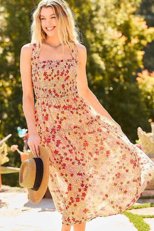 Elevate your style effortlessly with our Blossoming Beauty Midi Dress. The smocked front and tie waist accentuate your silhouette, while the elastic ruffle and floral print exude elegance. Perfect for any occasion, this dress will make you feel like a beautiful blooming flower.