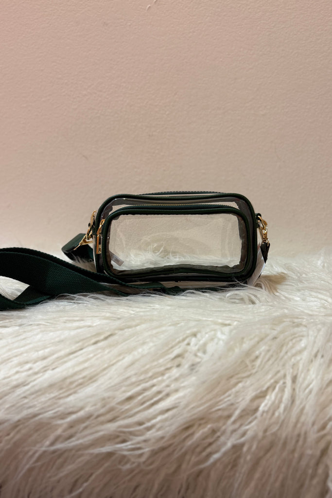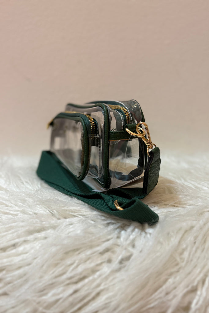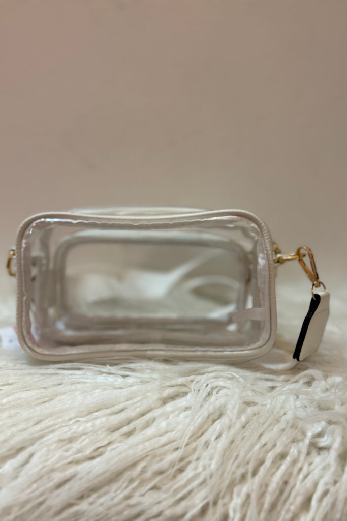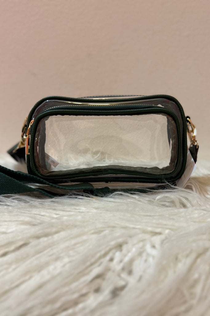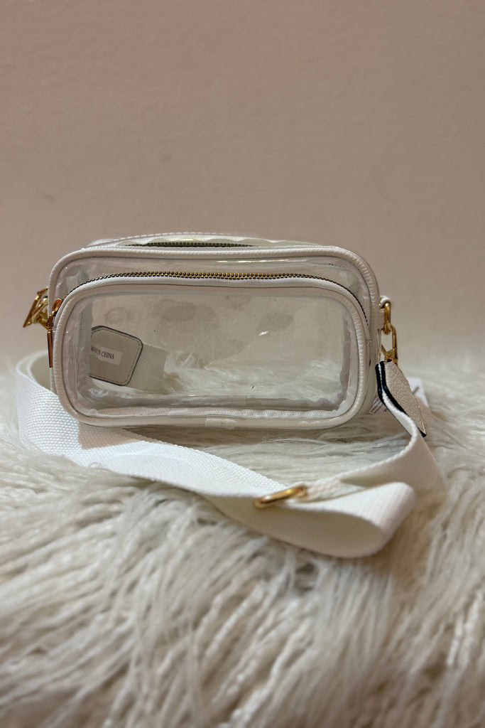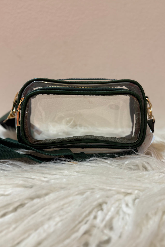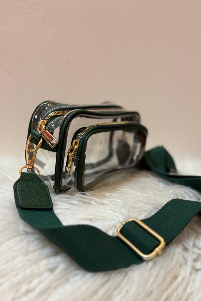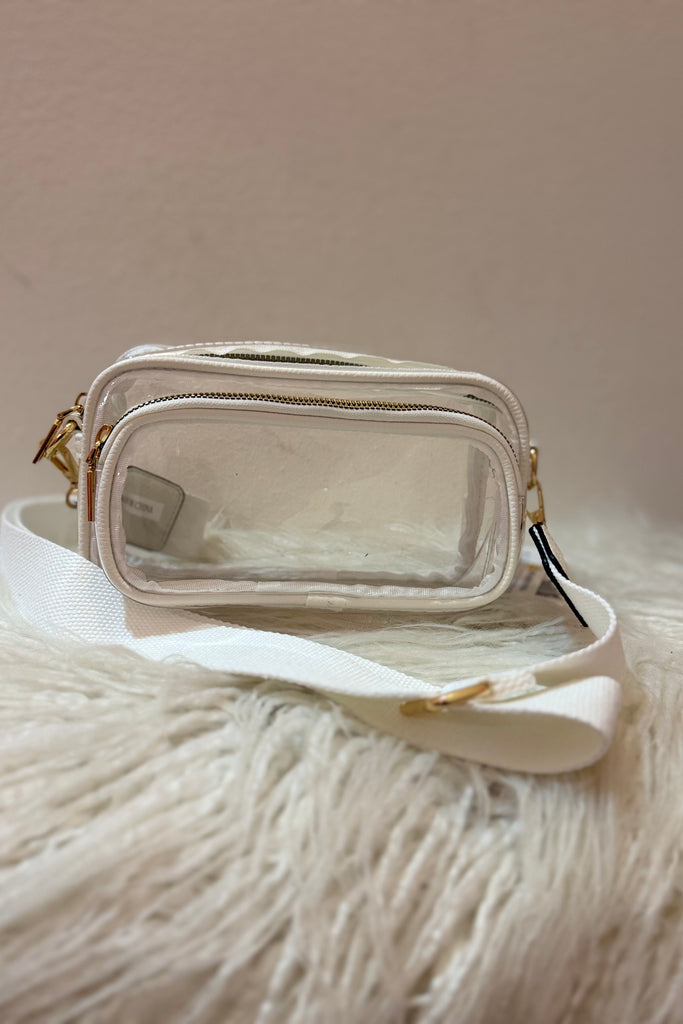 Featuring a transparent PVC body with structured colored trim, gold-tone hardware, and a convenient double-zip design, this bag keeps your essentials secure and easily accessible. The wide adjustable strap makes it comfortable for all-day wear — perfect for game days, concerts, rodeo nights, festivals, and travel.