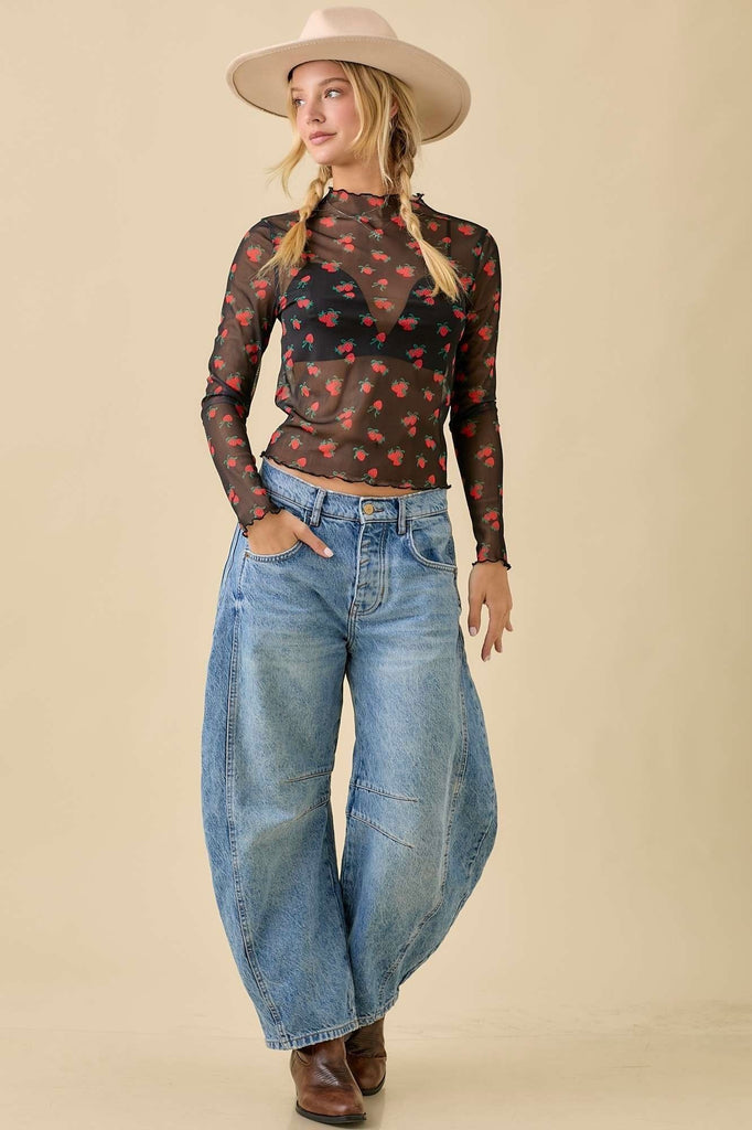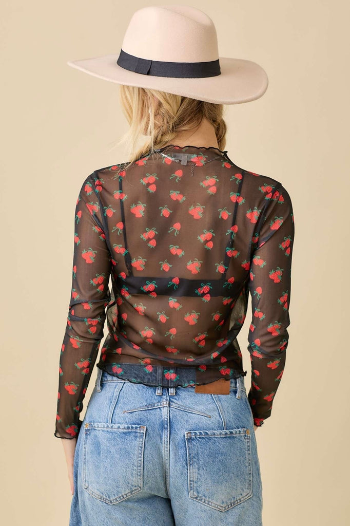 Sweeten your style with this adorable Strawberry Bow Print Mesh Top. Featuring a playful allover strawberry-and-bow pattern, this lightweight long-sleeve mesh layer adds the perfect touch of girly charm to any outfit.