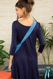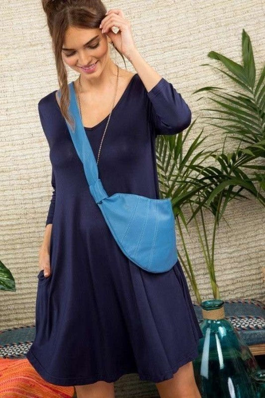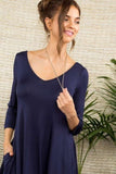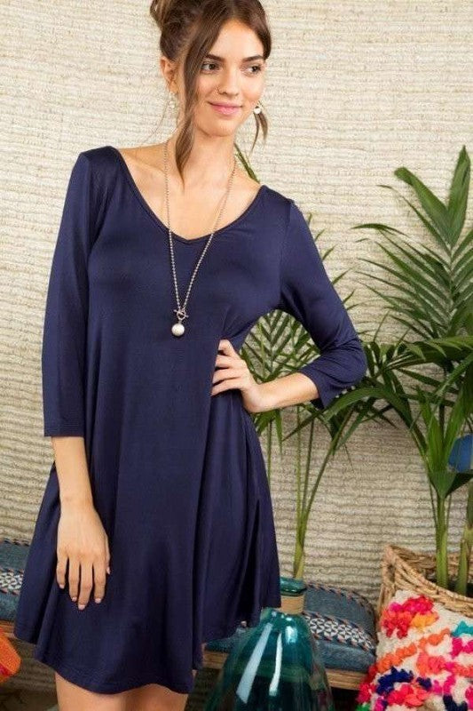 This 3/4 sleeve navy blue jersey dress boasts a comfortable, soft material that's perfect for everyday wear. With the added convenience of side pockets, this dress is an essential piece for your wardrobe. Elevate your style without losing comfort in this everyday basic that is sure to be your new favorite!