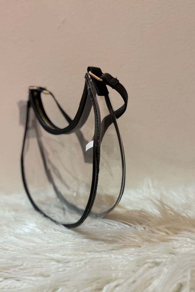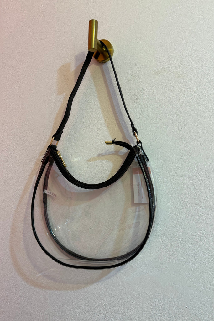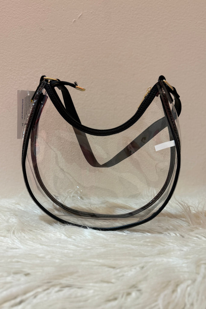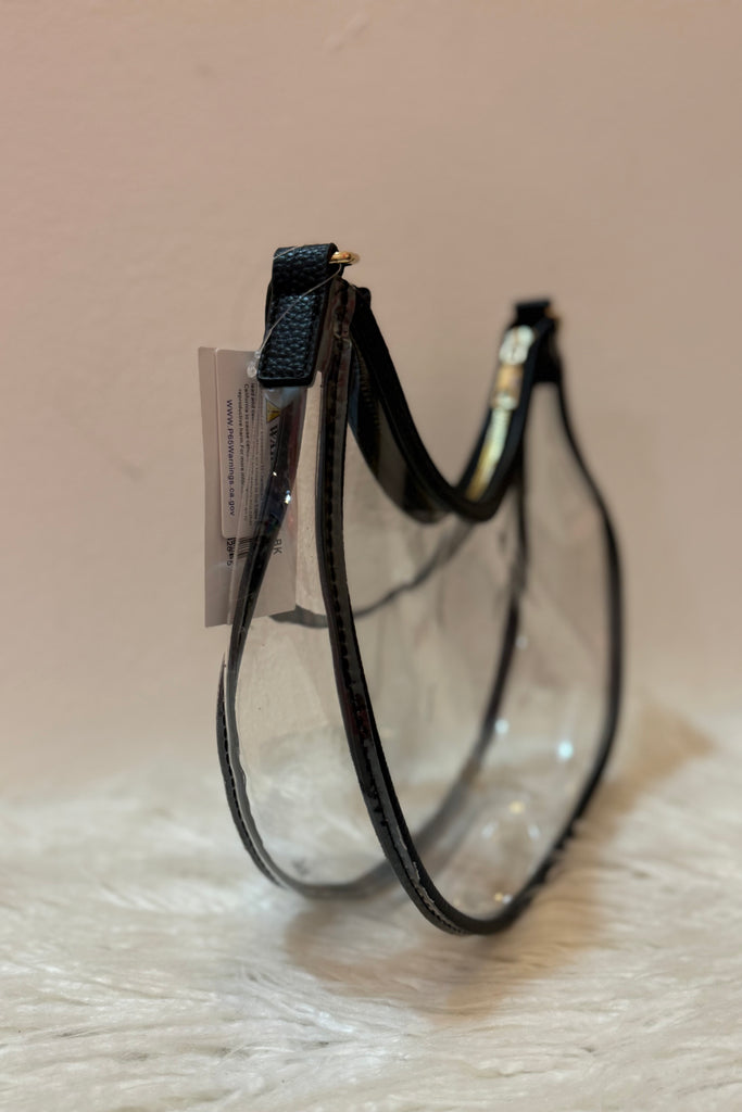 Designed with a curved hobo silhouette, transparent body, and sleek black trim, this bag blends edgy style with practical functionality. The lightweight clear PVC keeps you compliant with most stadium and concert policies, while the structured zipper closure keeps your essentials secure.