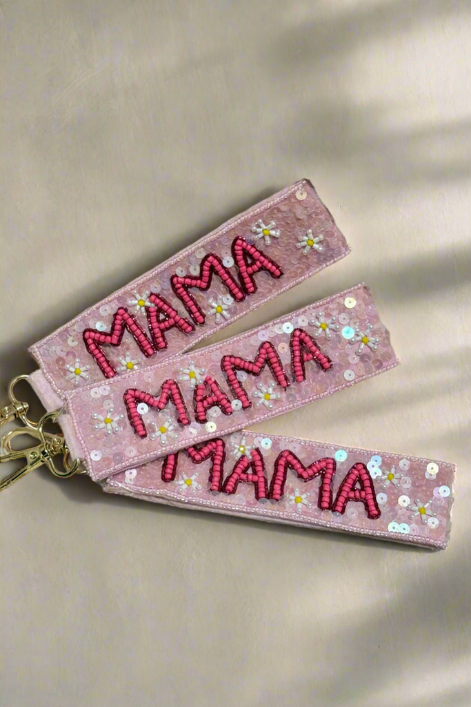 Show off your mama pride in style! This handmade wristlet keychain is the perfect mix of sparkle and cuteness. It features shimmering sequins, bold beaded “MAMA” lettering, and adorable daisy bead accents all crafted with love and care. Whether you're juggling errands or just need a stylish way to keep your keys close, this piece brings charm and function to your everyday.