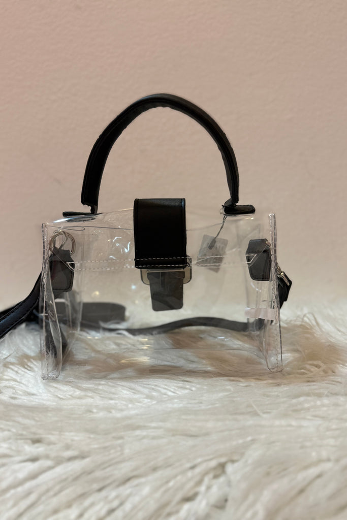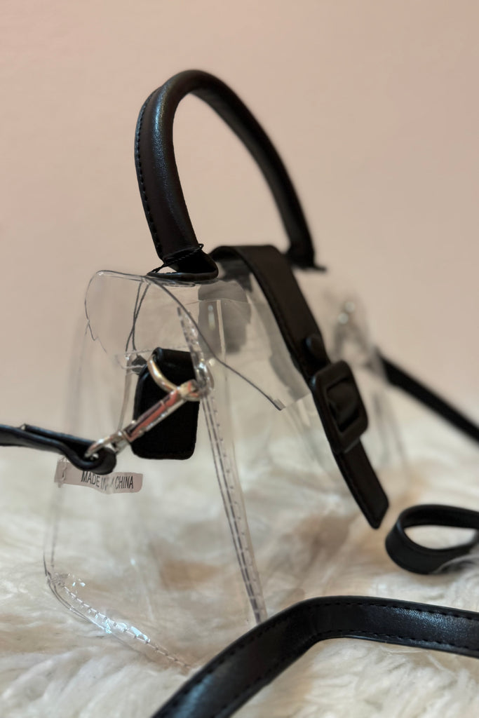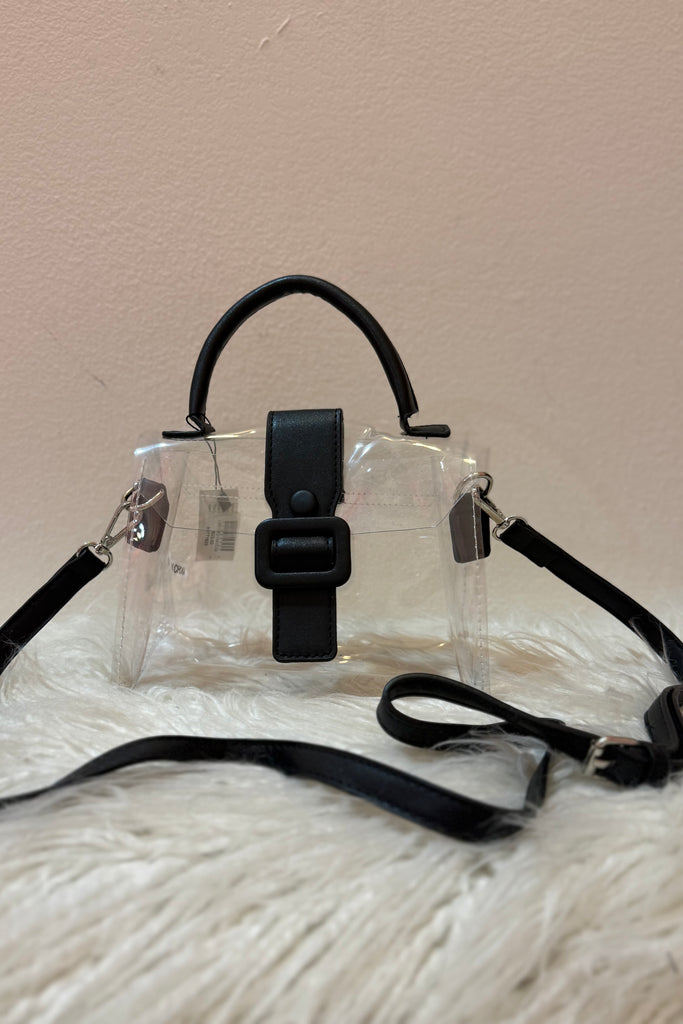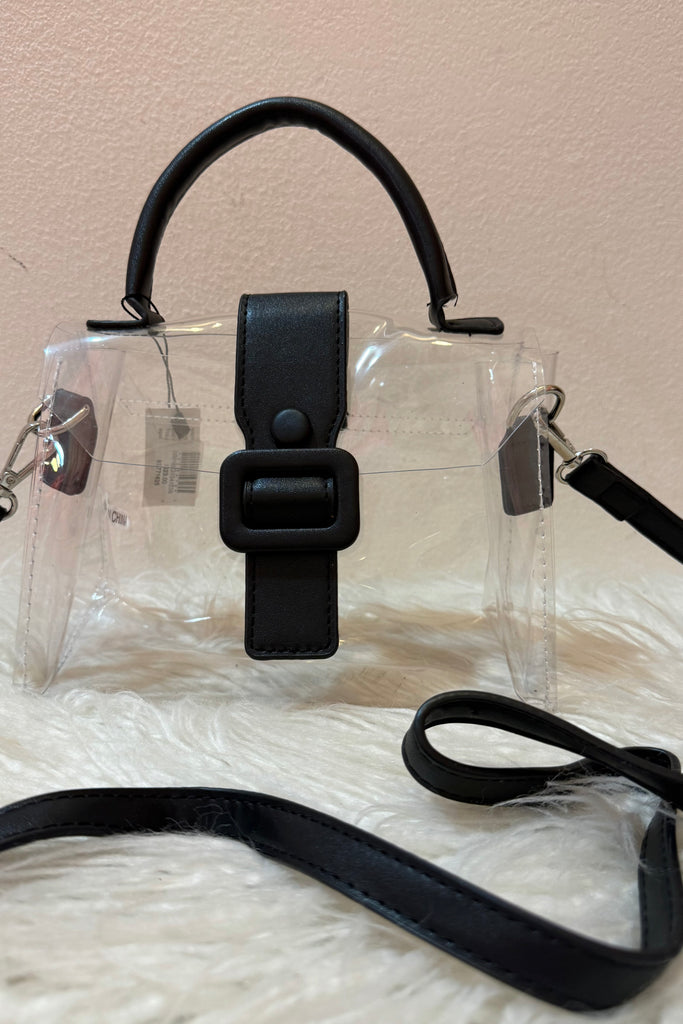 Featuring a transparent body with bold black vegan leather trim, a statement front buckle detail, structured top handle, and detachable crossbody strap — this bag blends edgy sophistication with everyday practicality.